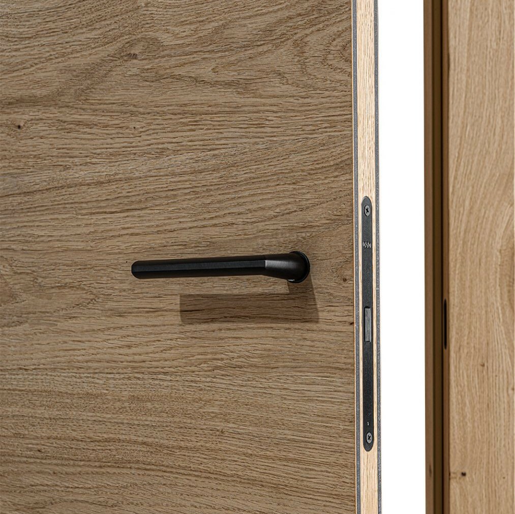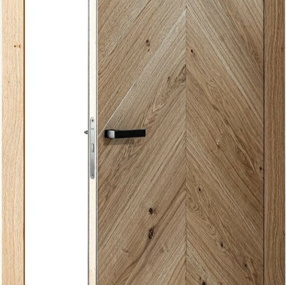 Die Oberfläche der Türflügel ist mit dreierlei Arten von Eichenholz gestaltet und verleiht dieser Türe ein charakteristisches Aussehen.