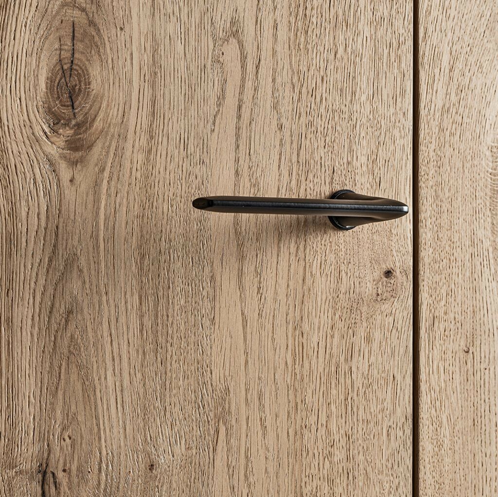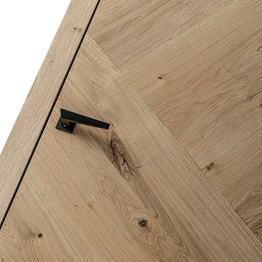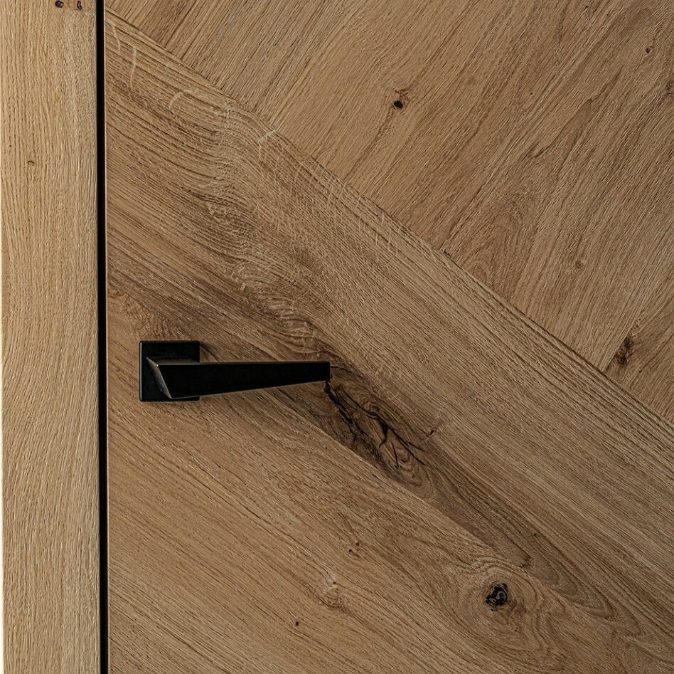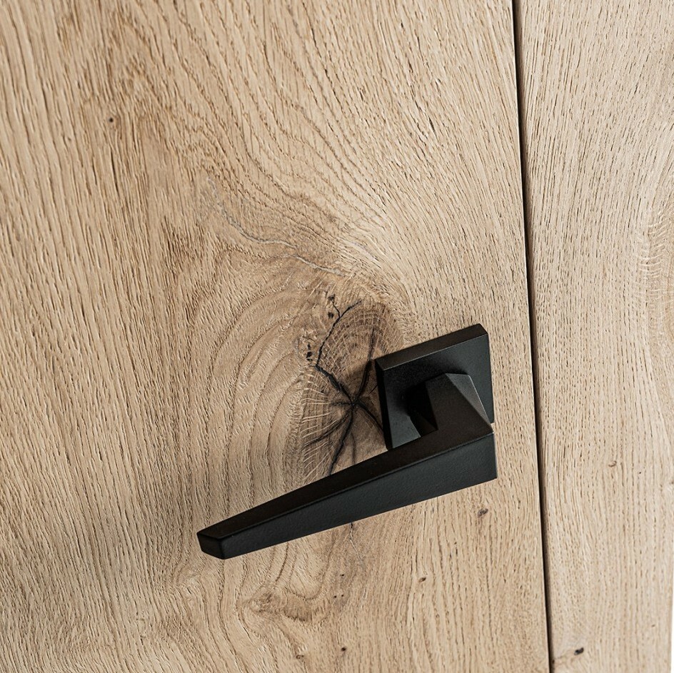 Das geometrische Design der Türklinke unterstreicht die Perfektion und Kraft, die sich in dieser Fertigung verbirgt. Zur Gesamtheit dieses Stils tragen die modernen Materialien, die händisch mit Fragmenten aus wilder Eiche verarbeitet wurden.