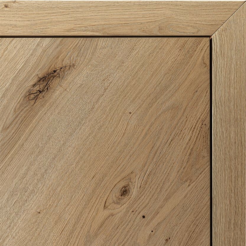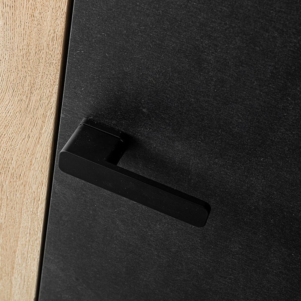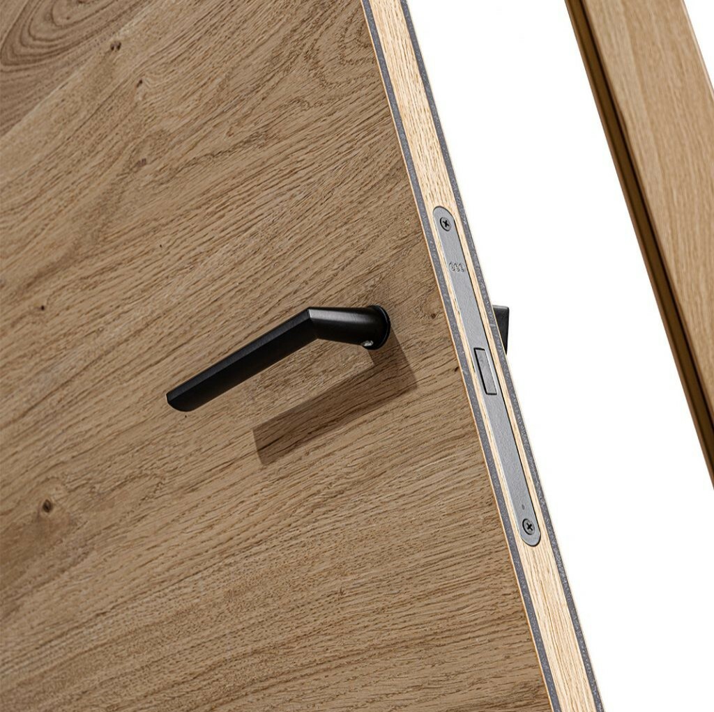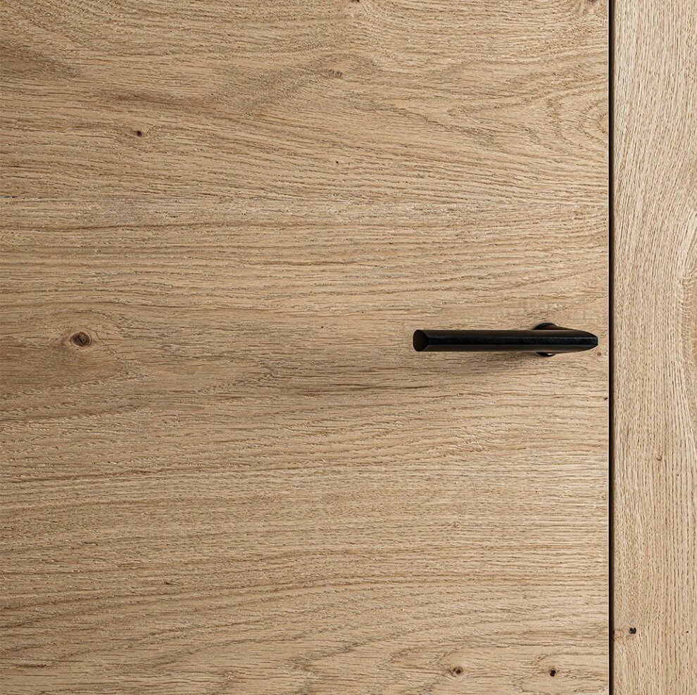 Das geometrische Design der Türklinke unterstreicht die Perfektion und Kraft, die sich in dieser Fertigung verbirgt. Zur Gesamtheit dieses Stils tragen die modernen Materialien, die händisch mit Fragmenten aus wilder Eiche verarbeitet wurden.