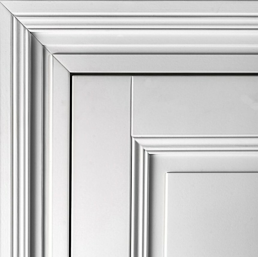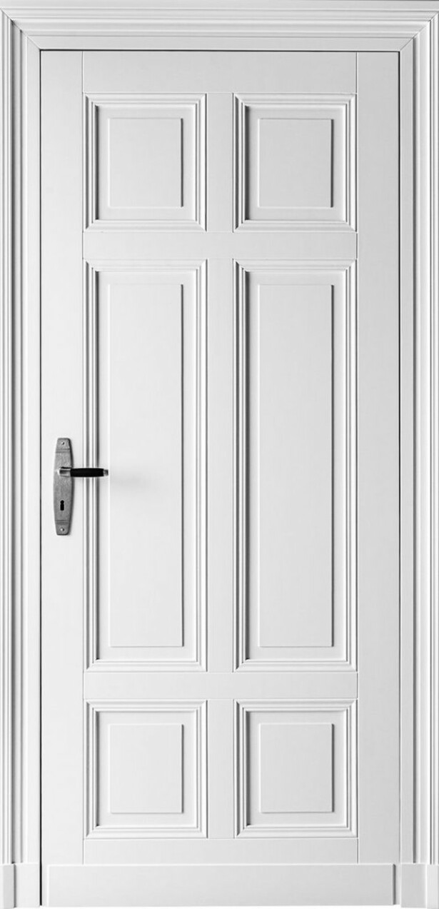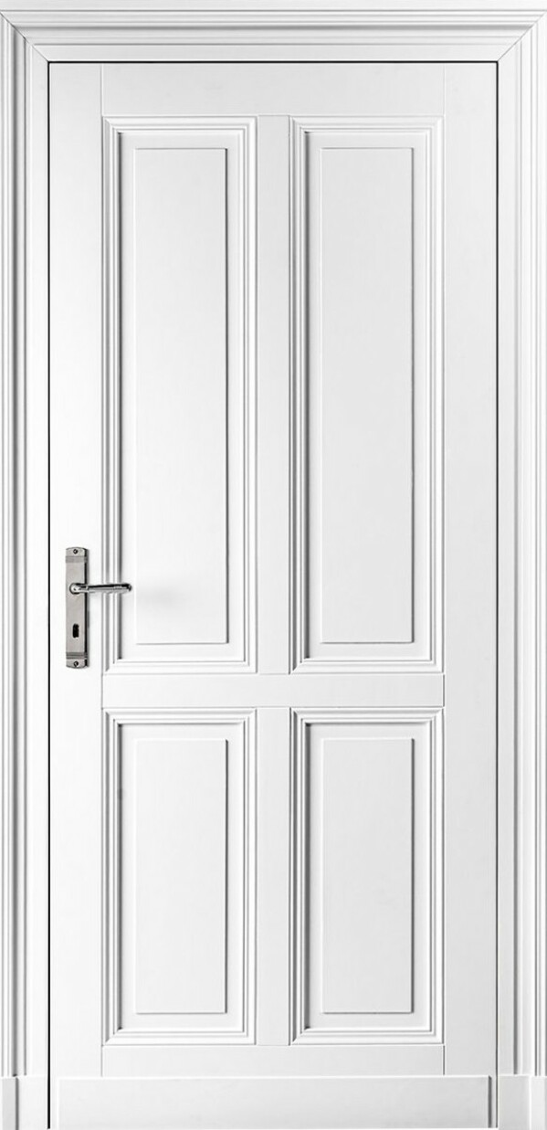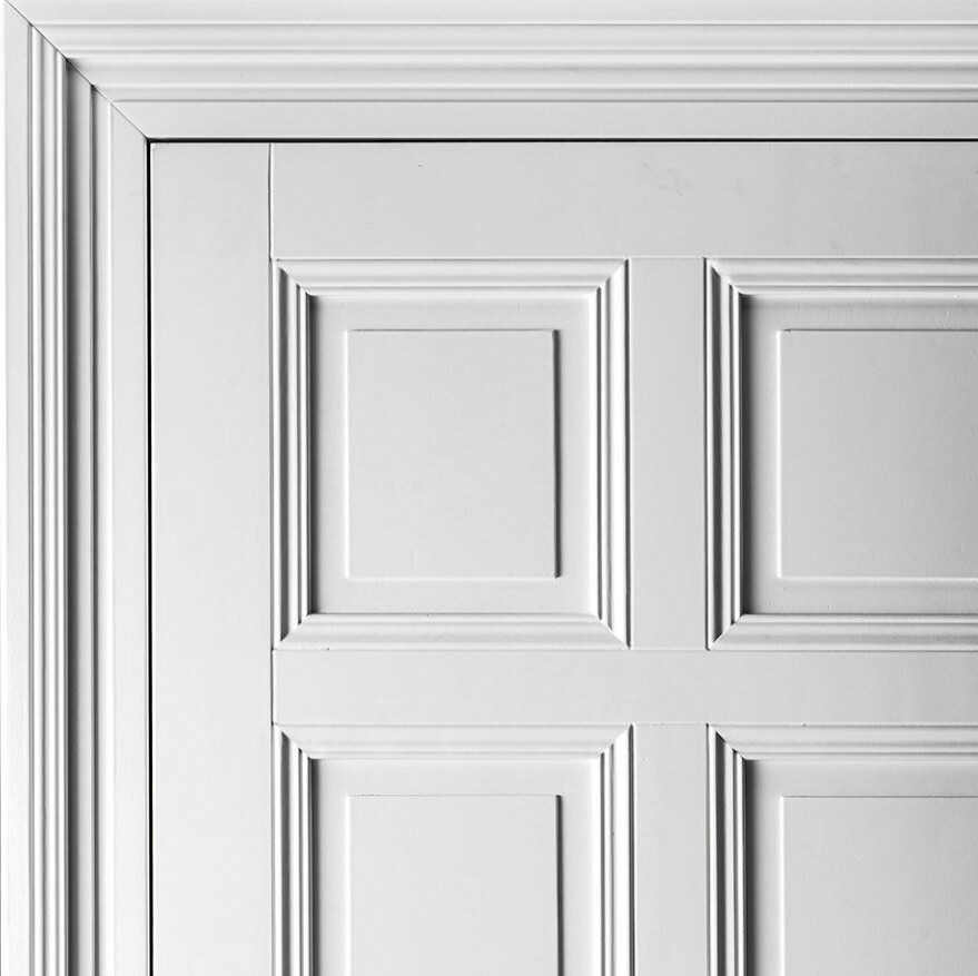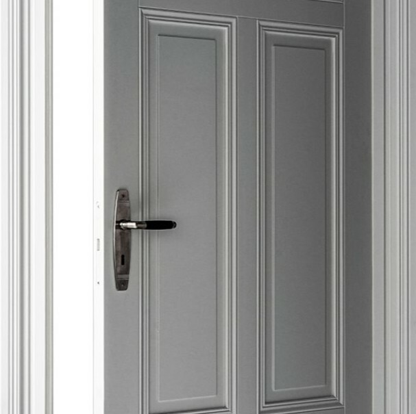 Klassische Türflügel in einem Block in Verbindung mit einem ausdrucksstarken Rahmen.