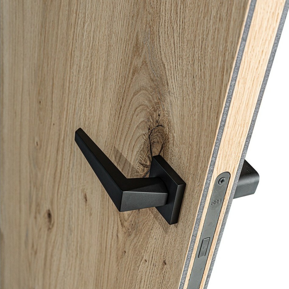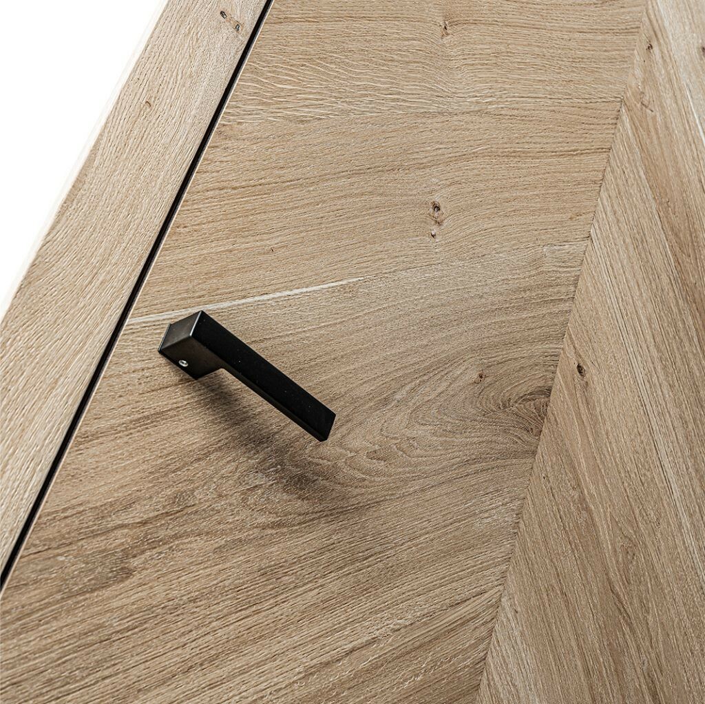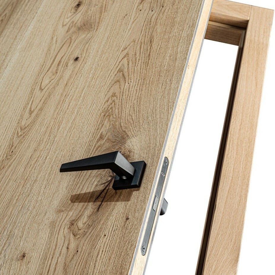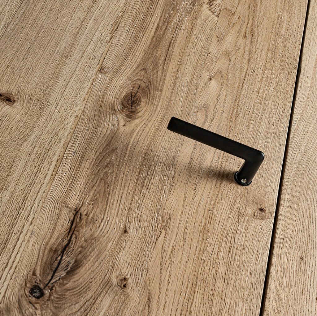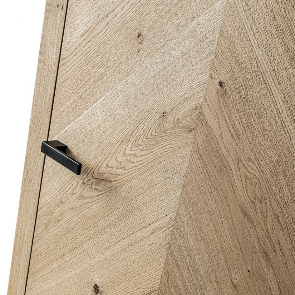 Das geometrische Design der Türklinke unterstreicht die Perfektion und Kraft, die sich in dieser Fertigung verbirgt. Zur Gesamtheit dieses Stils tragen die modernen Materialien, die händisch mit Fragmenten aus wilder Eiche verarbeitet wurden.