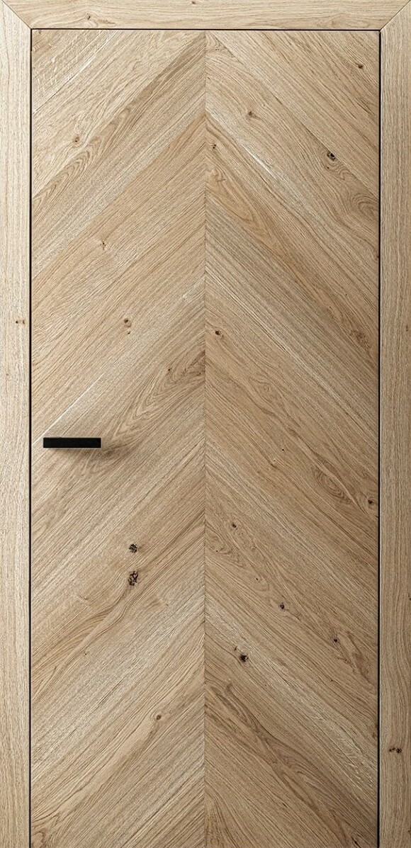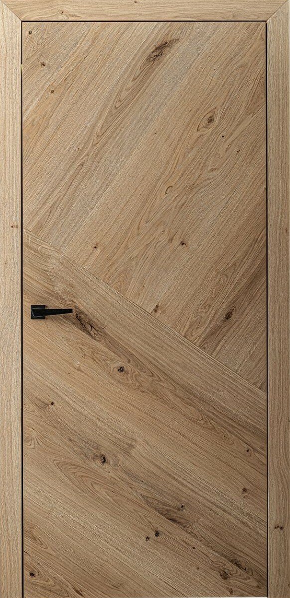 Die Oberfläche der Türflügel ist mit dreierlei Arten von Eichenholz gestaltet und verleiht dieser Türe ein charakteristisches Aussehen.